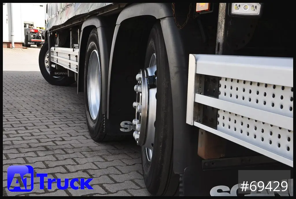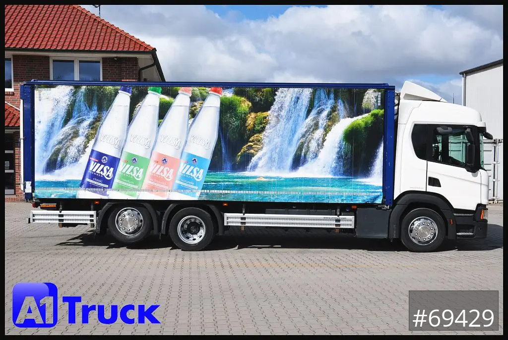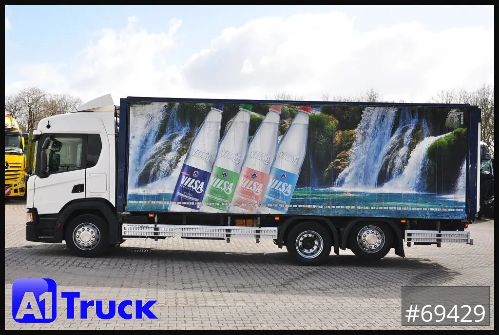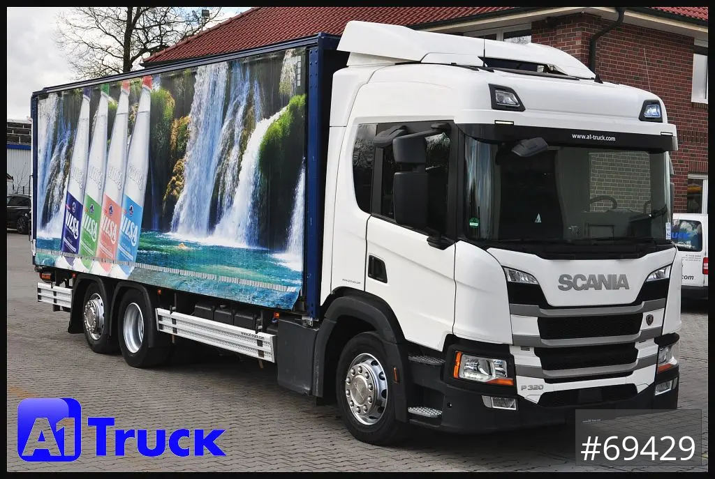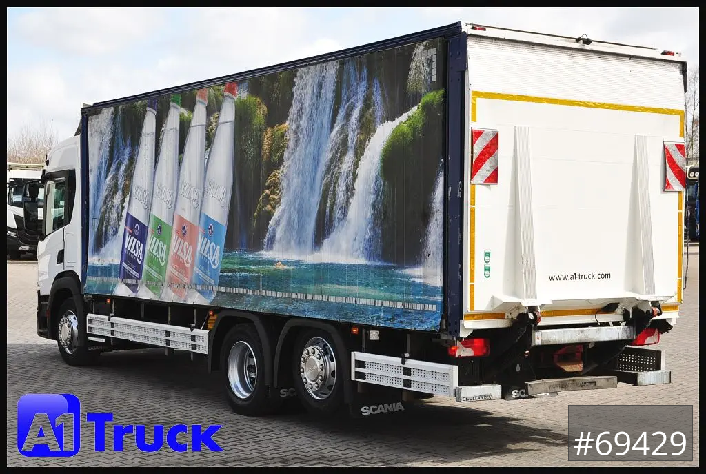 Scania P320 Getränkwagen 6x2, Ladebordwand: Dhollandia DHLM 30 Tragkraft 2500kg, Böse Getränkeaufbau, Heck Kamera, Dachluke